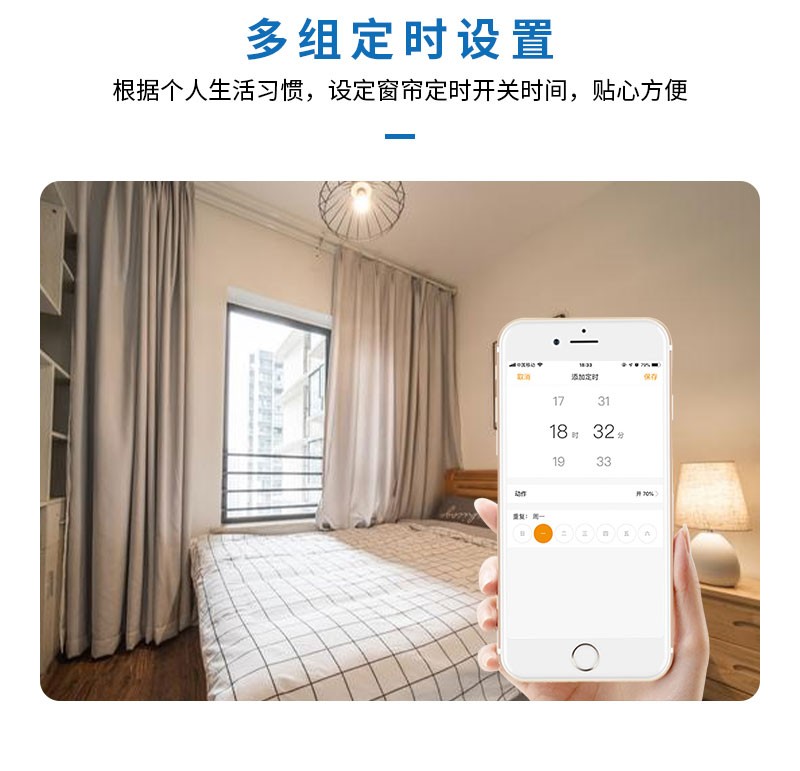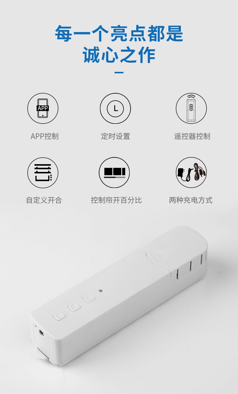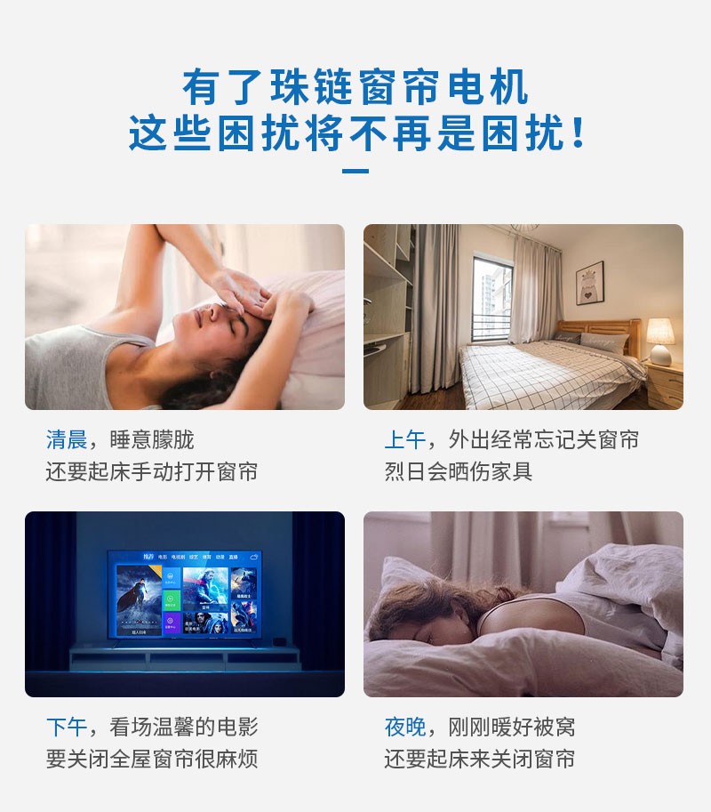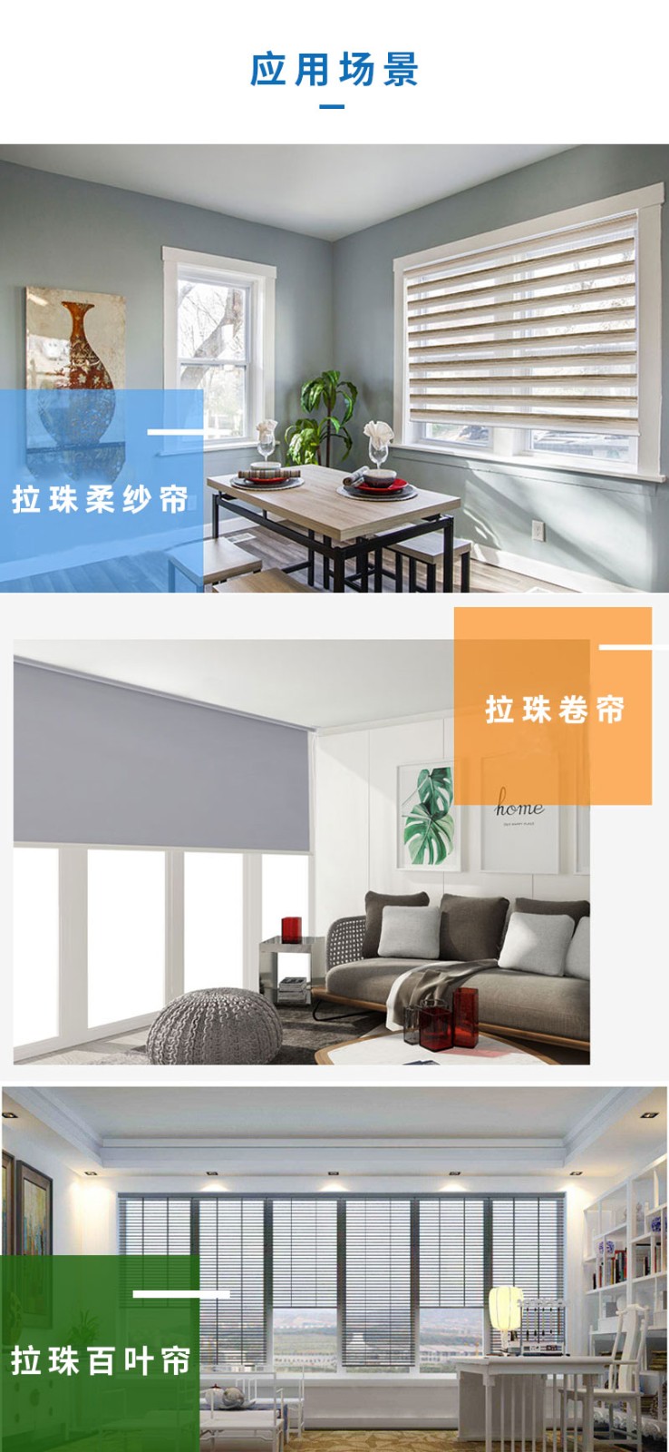 此產(chǎn)品適用于拉珠卷簾,可以把傳統(tǒng)的拉珠卷簾改變?yōu)橹悄茈妱哟昂煟惭b簡單,操作方便。安裝后可通過遙控器、語音、手機APP等控制窗簾升降。
